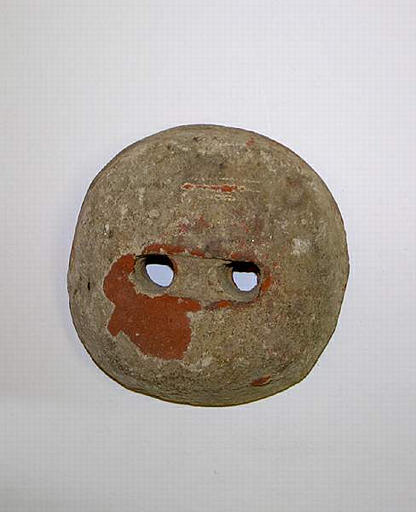 De forme circulaire, présentant une face plane et une face bombée. Percé de deux trous.