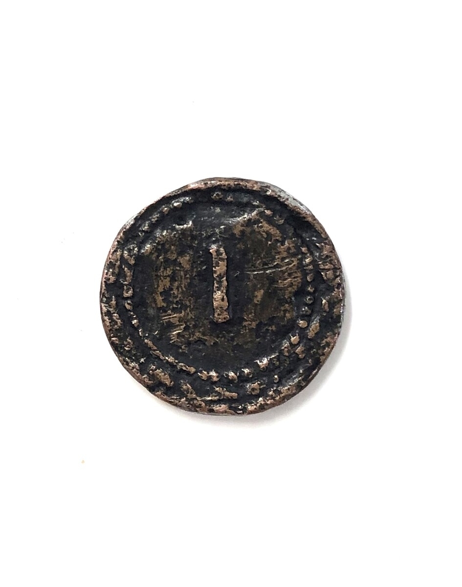 Il se présente sous la forme d’une pièce de monnaie de bronze d’un diamètre de 21 mm. Son épaisseur varie entre 2 et 2,3 mm et son poids est de 4,921 g. La face principale montre les ébats sexuels d’un couple sur un lit dont on voit nettement le matelas, les quatre pieds reposant sur le sol et une ligne semi-circulaire représentant un ornement du meuble. Si la posture de l’homme est claire, celle de la femme peut paraître ambiguë au premier regard. On serait d’abord tenté de distinguer sa poitrine et de penser qu’elle est couchée sur le dos, ce que la position de sa tête semble confirmer. Mais la manière dont elle s’appuie sur son bras droit – le seul visible –, prouve qu’elle est en réalité allongée sur le ventre et que sa tête est tournée en arrière pour regarder son partenaire. Ses fesses rebondies et ses deux jambes repliées confirment cette position. L’autre face de la pièce, moins bien conservée, porte le chiffre « I » entouré d’un grènetis et de feuilles de laurier.