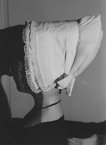 cette coiffe comprend : - une cayenne (sous coiffe)matelassée reconstituée en toile tailleur recouverte - une caye ( doublure) reconstituée en coton bleu cl air - du dessus de la coiffe en percale plissé à l'ongle (droit fil), avec un devant composé de deux volants plissés - un ruban en jaconas (L. 4.5 cm) fo rme un noeud (L. 17 cm) dans la nuque