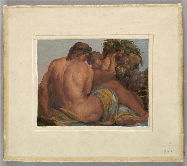 Homme avec un enfant tenant des fruits prend forme dans l'atelier de ALAUX Jean;LE ROMAIN (dit) en pleine 2e quart 19e siècle, à un moment où les artistes redéfinissent les frontières de leur art. Les circonstances de sa création, profondément liées à son époque, confèrent à cette œuvre du musée national du château de Fontainebleau une résonance historique considérable qui dépasse le cadre purement esthétique.