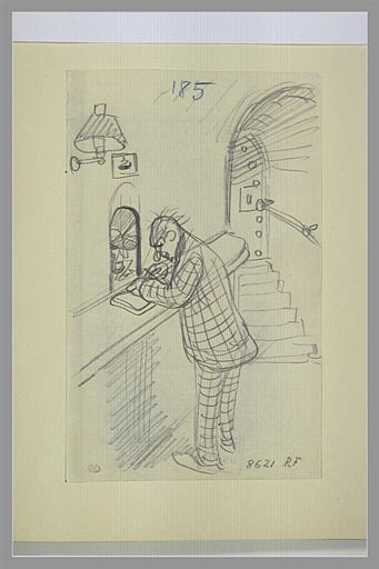 Album Caran d'Ache -3-, folio 27, rapporté au recto ; Album factice, à dos et coins de peau noire, et plats cartonnés recouverts de papier marbré à dominante violette, comprenant les dessins RF 8591 à RF 8630. H : 0,390 ; L : 0,290. ; Inscription, au crayon bleu, en haut :185