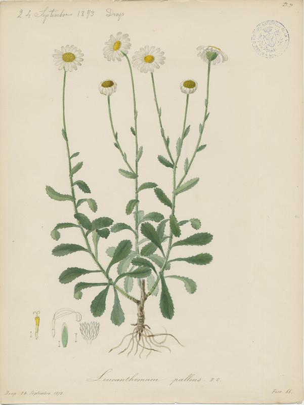 Marguerite à bractées pâles ; plante à fleurs (Barla Jean-Baptiste (1817-1896) (attribué à)) est une oeuvre des collections du muséum d'histoire naturelle relevant de sciences naturelles, dessin, botanique. La technique employée est : papier, encre, aquarelle. Elle mesure mesure en cm : H. 36,2 ; l. 27,3. Cette pièce a pour sujet : représentation scientifique,représentation végétale (marguerite). Cette réalisation date de la 3e quart 19e siècle. À propos de cette pièce : Nice, 1817 ; Nice, 1896.