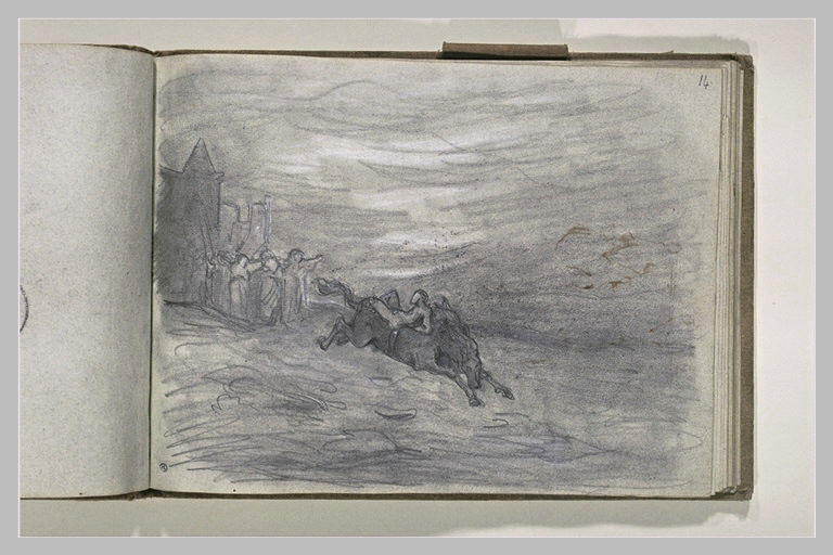 Album Bazille Frédéric -2-, folio 14, dessiné au recto ; Album cartonné recouvert de toile beige. Etudes de paysages, caricatures, études de nus et portraits. Traces de folios manquant entre les folios 1 et 2, 5 et 6, 11 et 12, 17 et 18, 20 et 21, 21 et 22, 26 et 27. H. 0,230 ; L. 0,305