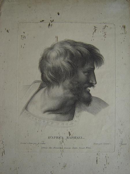 Tête d'homme d'après RAPHAEL, oeuvre de estampe, est due à CAZENAVE;CAILLAT A;Raphaël (1483-1520) (d'après) et conservée au musée d'Art et d'Histoire Louis Senlecq. papier vergé, manière de crayon est le procédé utilisé pour cette oeuvre. Elle mesure L. 20.5 cm ; H. 27 cm. Le motif représenté : figure (homme, tête, expression du visage). Sa période de création est la 19e siècle.