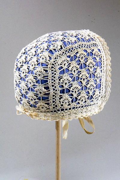 Béguin, patron C type 3a, blanc au crochet, partie médiane et côtés décorés de motifs d'oeillet stylisés à base de points de coquille ; pourtour décoré d'un double rang de points d'écaille et resserré par une fine tresse de coton nouée à la nuque ; deux rubans d'attache en tresse de coton