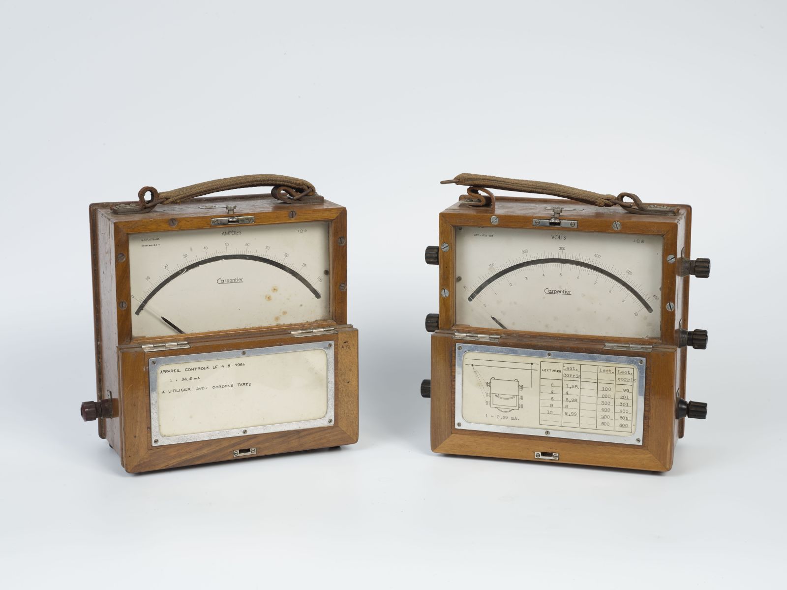 Voltmètre et ampèremétre de la marque Carpentier. Chacun est composé d'un coffret en bois avec un couvercle protégeant le cadran et une poignée en cuir.