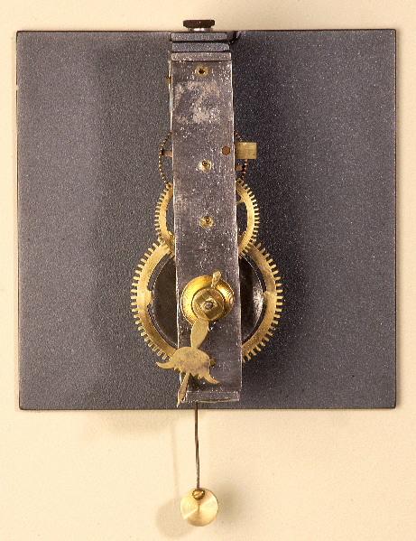 Engrenages ; Support ; Mouvement de Saint-Nicolas ' en ligne '. Il s'agit de l'un des premiers mouvements fabriqués par les horlogers aliermontais, au début du XVIIIème siècle. Il possède une seule aiguille, celle des heures, solidaire du barillet.