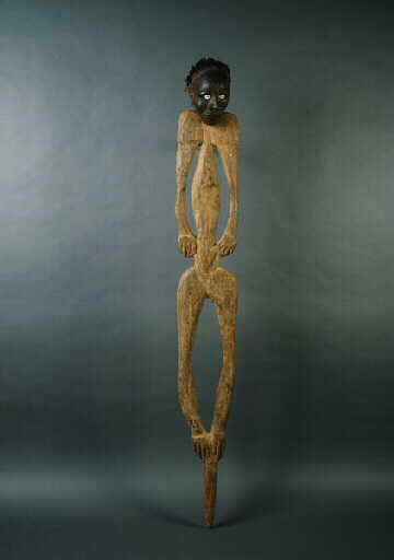 Mannequin en bois, représentant un corps humain (sexe non défini). Seuls les mains et les pieds sont sculptés. Un crâne d'ancêtre surmodelé est posé sur les épaules en guise de tête (crâne avec la face recouverte d'argile peinte dont les yeux sont représentés par un cauris, le nez proéminent, la bouche fermée, trois trous sont percés dans le lobe de l'oreille gauche)