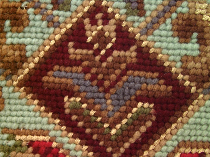anonyme a utilisé ici tissu (canevas), brodé. Dimensions : L. 315 ; L. 275 (1er) /L. 315 ; L. 275 (2eme) ; Pds. 26 (1er) / 26 (2eme). L'oeuvre représente : ornement à forme végétale (fleur),ornement à forme géométrique. Cette réalisation date de la 19e siècle.
