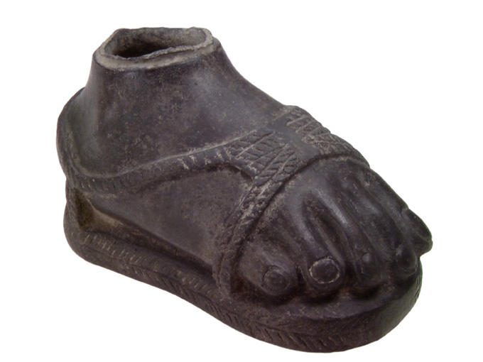 vase en forme de pied, revêtu d'une sandale nasca. Terre cuite noire