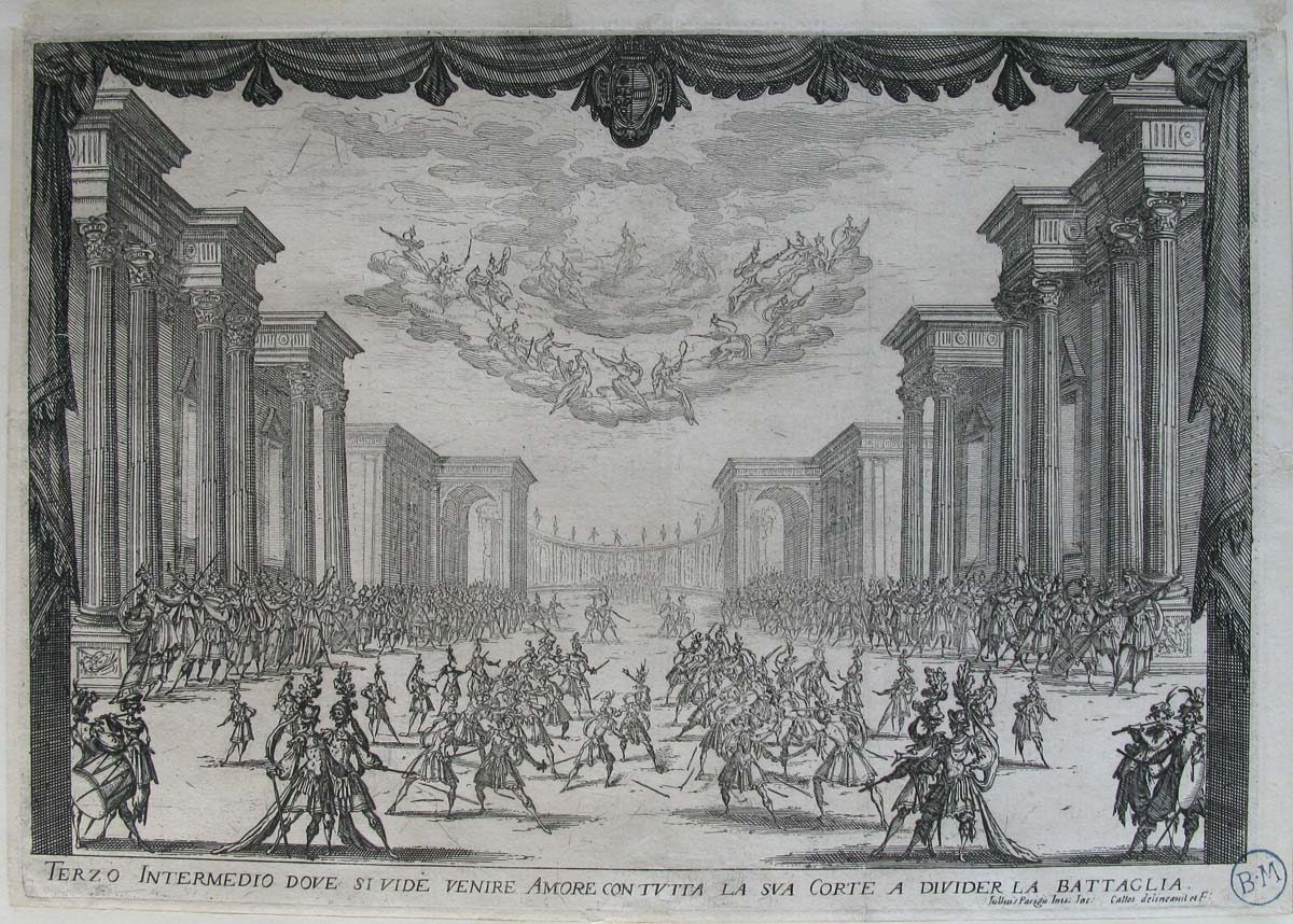 3e Intermède : La bataille est arrêtée par l'Amour, oeuvre de estampe, est due à Callot Jacques (1592-1635) et conservée au musée des beaux-arts. Cette pièce est en papier à la cuve (eau-forte). Ses dimensions sont Hauteur en cm 21,6 ; Largeur en cm 30,2. Le motif représenté : (scène de vie). Cette pièce remonte à la 1er quart 17e siècle. Informations complémentaires : Nancy, 1592 ; Nancy, 1635.