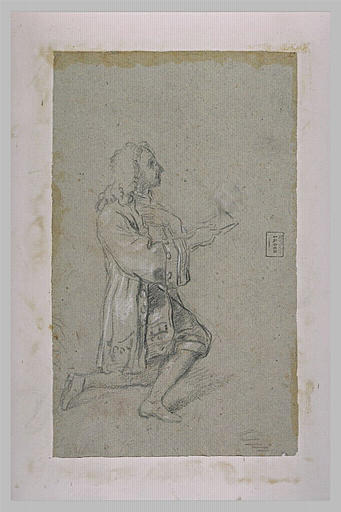 Homme agenouillé, tourné vers la droite, présentant quelque chose est une pièce de dessin réalisée par Calandrucci Giacinto (1646-1707), au musée du Louvre. Calandrucci Giacinto (1646-1707) a utilisé ici pierre noire, papier (gris-vert), blanc (rehaut). Mesures : H. en m 0,270 ; L. en m 0,408. Elle a été créée durant la 2e moitié 17e siècle;1er quart 18e siècle. Informations complémentaires : né en 1646 ; mort en 1707.
