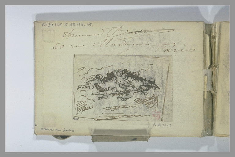 Album Berton Armand -3-, dessiné sur le plat de devant ; Album semi-factice, à couverture de toile grise, comportant 46 feuillets (numérotés de 1 à 45, avec un 2bis) dessinés, ou sur lesquels sont collés des dessins. Presque tous les dessins portent la marque du Musée d'Art Moderne (L. 1899a). Sur le plat de derrière : annotation à la plume et encre brune :Armand Berton + 1917, et le cachet du Musée National du Luxembourg. H : 0,119 ; L : 0,175