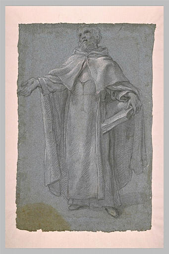 De Calandrucci Giacinto (1646-1707), Un moine debout, tenant un livre, étendant le bras droit est conservée au musée du Louvre dans le domaine dessin. L'oeuvre a été exécutée en pierre noire, blanc (rehaut), papier (bleu). Ses dimensions sont H. en m 0,435 ; L. en m 0,282. Le motif représenté : figure (saint Jean de Matha, en pied, portant, livre : ouvert). Sa période de création est la 2e moitié 17e siècle;1er quart 18e siècle. Note sur cette oeuvre : né en 1646 ; mort en 1707.