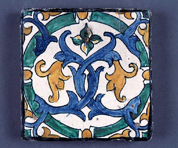 Tableau de carreaux de faïence émaillée : Marcus Curtius se précipitant dans le…
