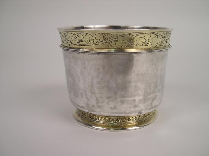argent partiellement doré, forgé ; forme cylindrique, leger piédouche soudé au corps, bord supérieur légèrement évasé.#Décor gravé et repoussé : liseré du col doré gravé d'une frise de feuillages, séparé du reste par une moulure saillante dorée ; piédouche doré et mouluré, orné d'un motif à redents ciselés.#Semblable au gobelet figurant sur un tableau de Sébastien Stoskopff (1597-1657), reproduit p.191 dans 'Un maître de la nature morte'.#2 poinçons : 1 poinçon de maître non identifié: 1/2 lune dans un écu (cf. Rosenberg n°703/704) et 1 poinçon de la ville de Fribourg-en-Brisgau.