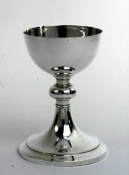 Calice en argent dont le pied comporte un ressaut sur lequel est gravée une croix. Du pied s'élève une tige coupée par un noeud qui supporte une coupe dont l'intérieur est en argent doré.