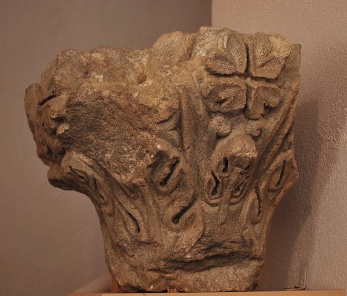 Elle est réalisée avec la technique suivante : calcaire, taillé. Mesures : Hauteur en cm 35 ; Largeur en cm 42 ; Diamètre en cm 20. Le motif représenté : ornementation (ornement à forme végétale, feuille). Cette pièce remonte à la 9e siècle;10e siècle.