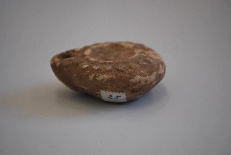 Le procédé technique employé est terre cuite, moulage, engobe. Dimensions : Hauteur en cm 1.90 ; Longueur en cm 5.20 ; Diamètre en cm 4.30.