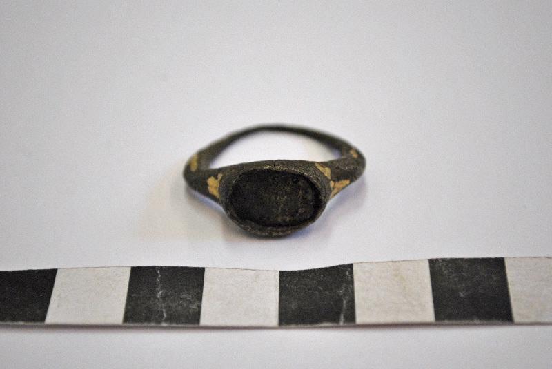 Bague en bronze doré, Guiraud type 3, à anneau filaire au départ, s'épaississant pour former 2 épaules à l'approche du chaton ovale, en creux (ayant perdu son décor).