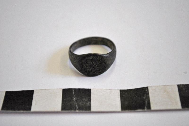 Bague en argent (?), d'un seul tenant, à anneau de section en D, s'élargissant; à chaton plutôt circulaire, plat, gravé de IHS.