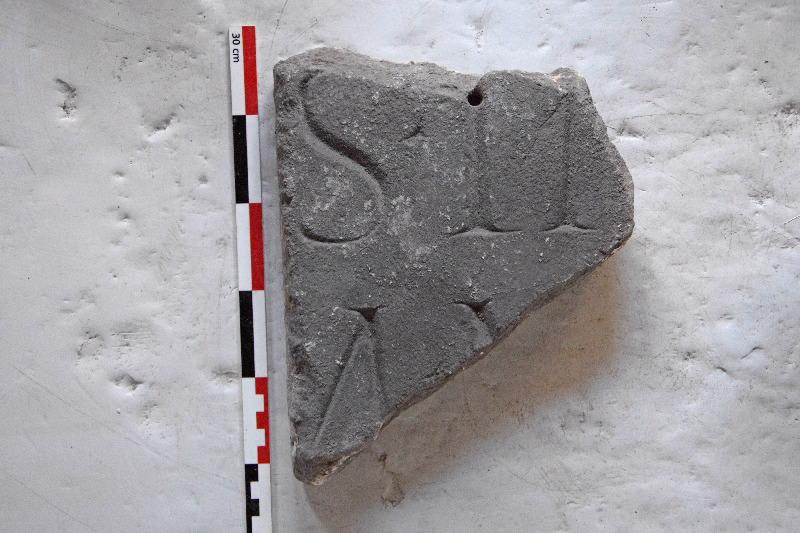 Fragment d'inscription en marbre blanc dont subsiste, sur 2 lignes, les lettres : V (peut-être un N) LI . S