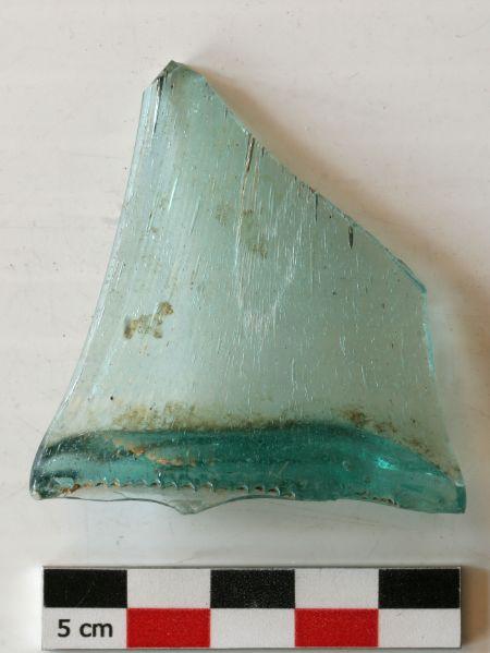 Incomplet. Seul subsiste un fragment de base d'anse, orné de fines stries verticales. Verre bleu turquoise clair, translucide.