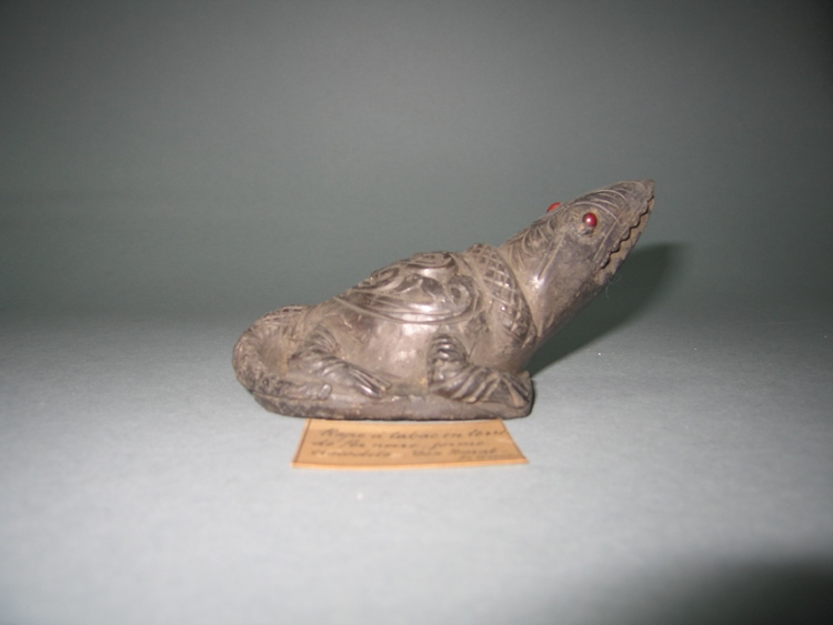 Oxyde de fer noir (?) ; Rape à tabac noir en forme de crocodile. Tête levée et de forme triangulaire. Deux yeux de couleurs rouge et noir. Décor en relief sur tout le corps de l'animal. Hachures sous la rape.