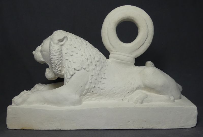 moulage non patiné d'un lion surmonté d'un anneau ; tiré à partir d'un moule à pièces (nombreuses coutures apparentes)