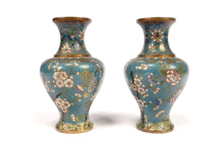 Paire de vases à panse fuselée, haute épaule arrondie dotée d'un anneau à la liaison avec le col, haut col large évasé à anneau, à base cintrée à anneau et fond concave. Décor polychrome d'émaux cloisonnés.#Après le travail de la pièce de cuivre par martelage et soudure, et le traçage du motif souhaité, de minces fils de cuivre sont courbés puis collés ou soudés sur la pièce qui est chauffée à 1200°C. Les cloisons constituées sont remplies d'émaux, cuits à 1000°C. Les émaux se rétractant à la cuisson, il est parfois nécessaire de renouveler l'opération. La pièce est ensuite polie à l’aide de pierres, comme l’émeri, ou de carbone.#Les anneaux de cuivre sont dorés au mercure.#Bon état.
