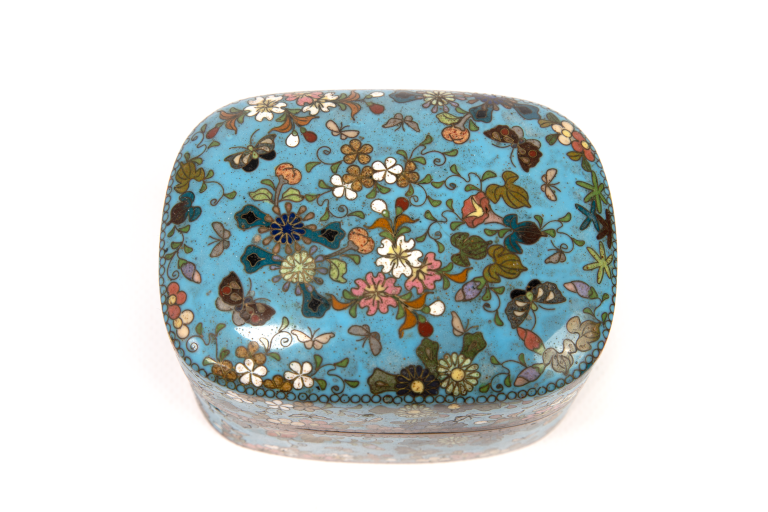 Boîte parallélépipédique à bords arrondis, à fond concave et couvercle bombé, à décor polychrome d'émaux cloisonnés.#Après le travail de la pièce de cuivre par martelage et soudure, et le traçage du motif souhaité, de minces fils de cuivre sont courbés puis collés ou soudés sur la pièce qui est chauffée à 1200°C. Les cloisons constituées sont remplies d'émaux, cuits à 1000°C. Les émaux se rétractant à la cuisson, il est parfois nécessaire de renouveler l'opération. La pièce est ensuite polie à l’aide de pierres, comme l’émeri, ou de carbone.#Très bon état.