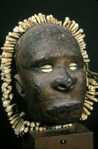 Crâne d'ancêtre surmodelé. La face est recouverte d'argile, les yeux sont représentés par des cauris, le nez est busqué, la bouche fermée. La chevelure est représentée par des rangées de dents implantées en auréole autour du visage.