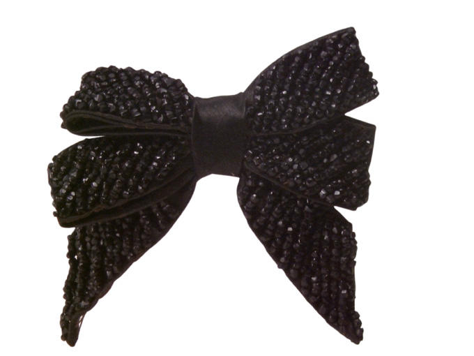 Noeud de chaussure pour femme. Noeud papillon en satin noir entièrement recouvert de perles de jais.