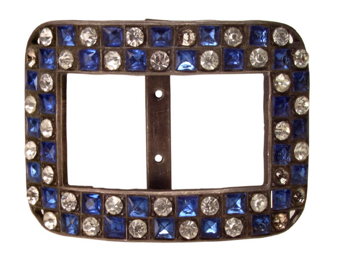 Boucle de chaussure pour femme de forme rectangulaire bombée. Bords arrondis évidée au centre. Tour en strass bleu et blanc.
