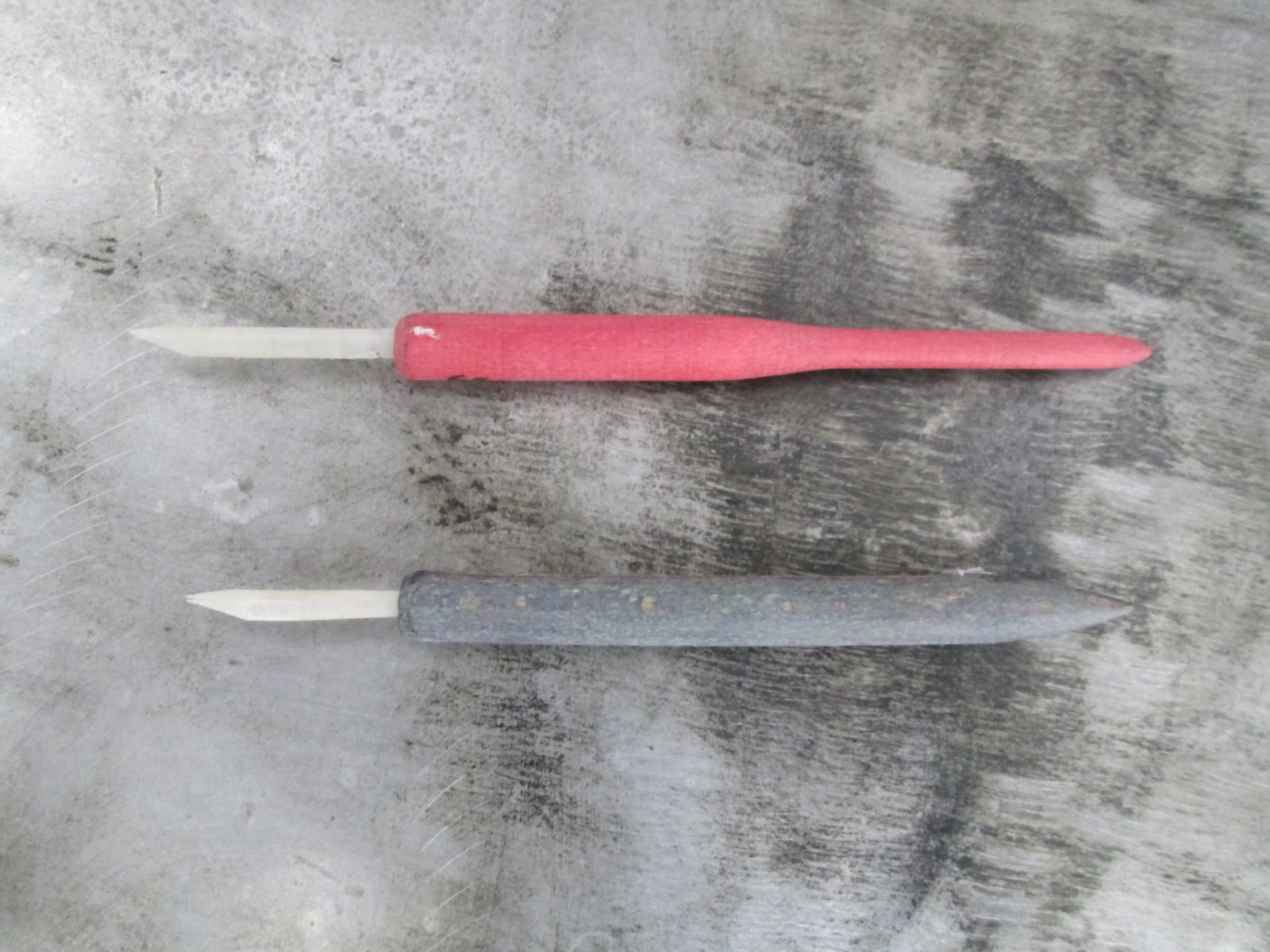 Lot de 4 porte-plumes de dimensions et couleurs différentes (rose, vert, naturel), peints, mais non vernis à cause des consignes d'économie.