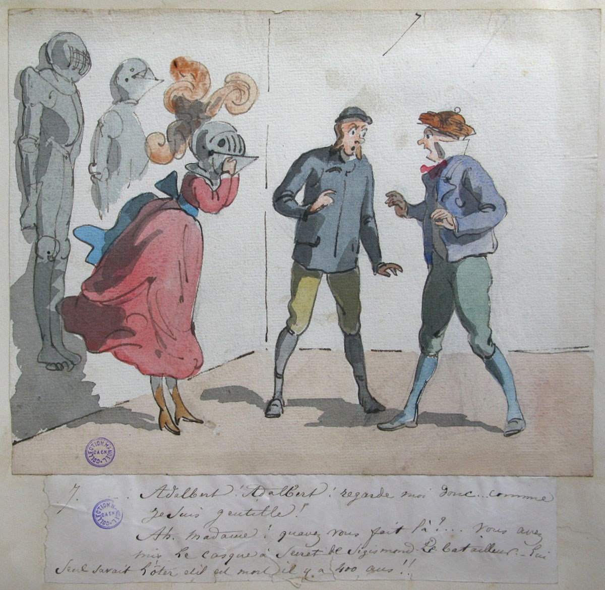 L'oeuvre 7. Adalbert ! Adalbert ! regarde moi donc.. Comme je suis gentille ! ; Les Aventures de Zénaïde et d'Adalbert au château de Schiffschaffburg (titre factice de la série) de Le Pippre Septime (1833-1871) fait partie des collections du musée des beaux-arts. Cette pièce est en papier (dessin à l'encre, aquarelle). Ses dimensions sont Hauteur en cm 25,3 ; Largeur en cm 35. Cette pièce remonte à la 19e siècle. À propos de cette pièce : Montfort-l'Amaury, 1833 ; Le Mans, 1871.