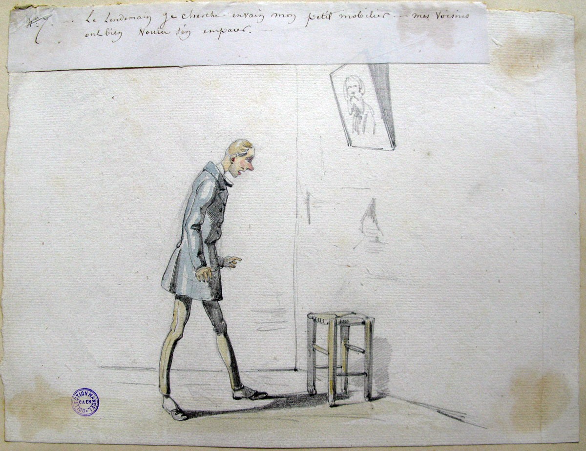 De Le Pippre Septime (1833-1871), 7. Le lendemain je cherche en vain mon petit mobilier.. ; Les tribulations d'un apprenti peintre (titre factice de la série) est conservée au musée des beaux-arts dans le domaine dessin. Le Pippre Septime (1833-1871) a utilisé ici papier (dessin à l'encre, aquarelle). Mesures : Hauteur en cm 18 ; Largeur en cm 22,5. Elle a été créée durant la 19e siècle. Note sur cette oeuvre : Montfort-l'Amaury, 1833 ; Le Mans, 1871.