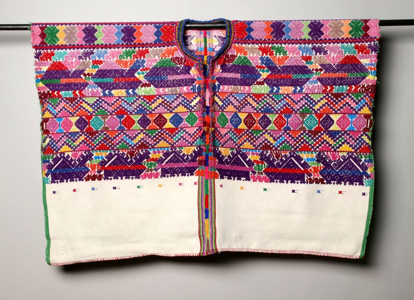 L'oeuvre a été exécutée en coton (tissage, toile, broché, cousu), matériau d'origine synthétique (teinture). Mesures : L. 124 cm ; l. 93 cm ; L. 11,5 cm (Encolure). Cette pièce a pour sujet : représentation animalière (oiseau, serpent, quadrupède, chien),ornementation (ornement à forme géométrique, chevron, losange). L'oeuvre appartient à la 4e quart 20e siècle. Concernant cette pièce : Les Cakchiquels sont un groupe ethnique issu de la civilisation maya.