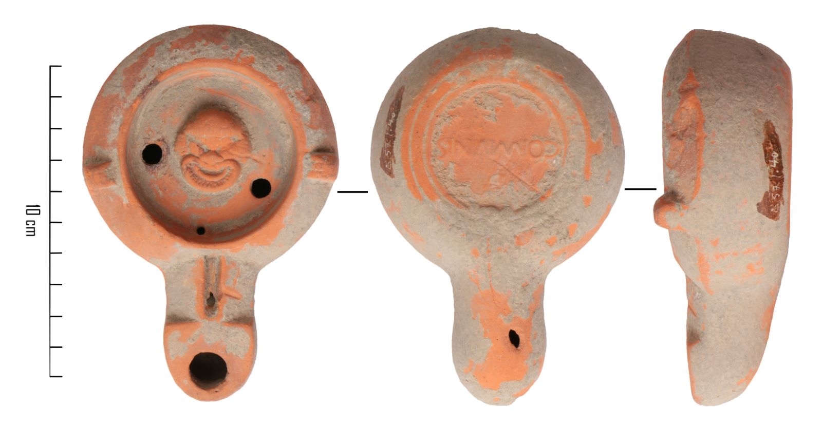 This work belongs to the field: archéologie, romain, vie domestique, croyances - coutumes, céramique. It was created using the following materials and techniques: terre cuite (moulé, engobe, cuisson). Its period of creation is identified as: 2nd half 1st Century;2nd Century.