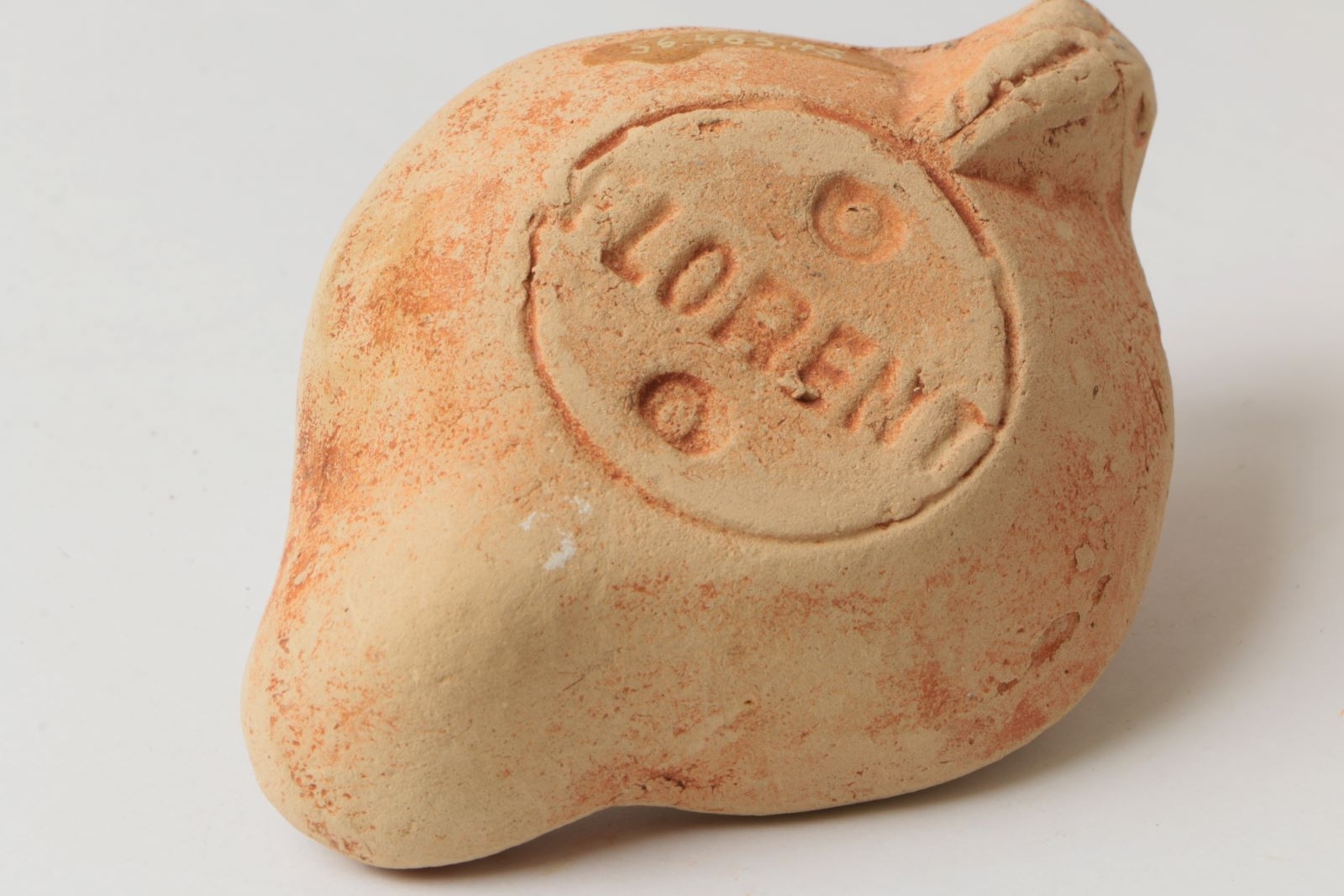 Loeschcke VIII H - Bussière D X. Lampe moulée avec une anse. Anse verticale percée ornée de deux sillons sur la tranche. Réservoir de profil tronconique. Disque en cuvette limitée par un bourrelet. Bandeau décoré penché vers l'extérieur. Bec arrondi cordiforme. Base circulaire plate limitée par un sillon enfermant la marque de potier en creux "FLORENT". Nombreuses bavures d'argile, particulièrement sur la anse. Pas de traces d'utilisation.