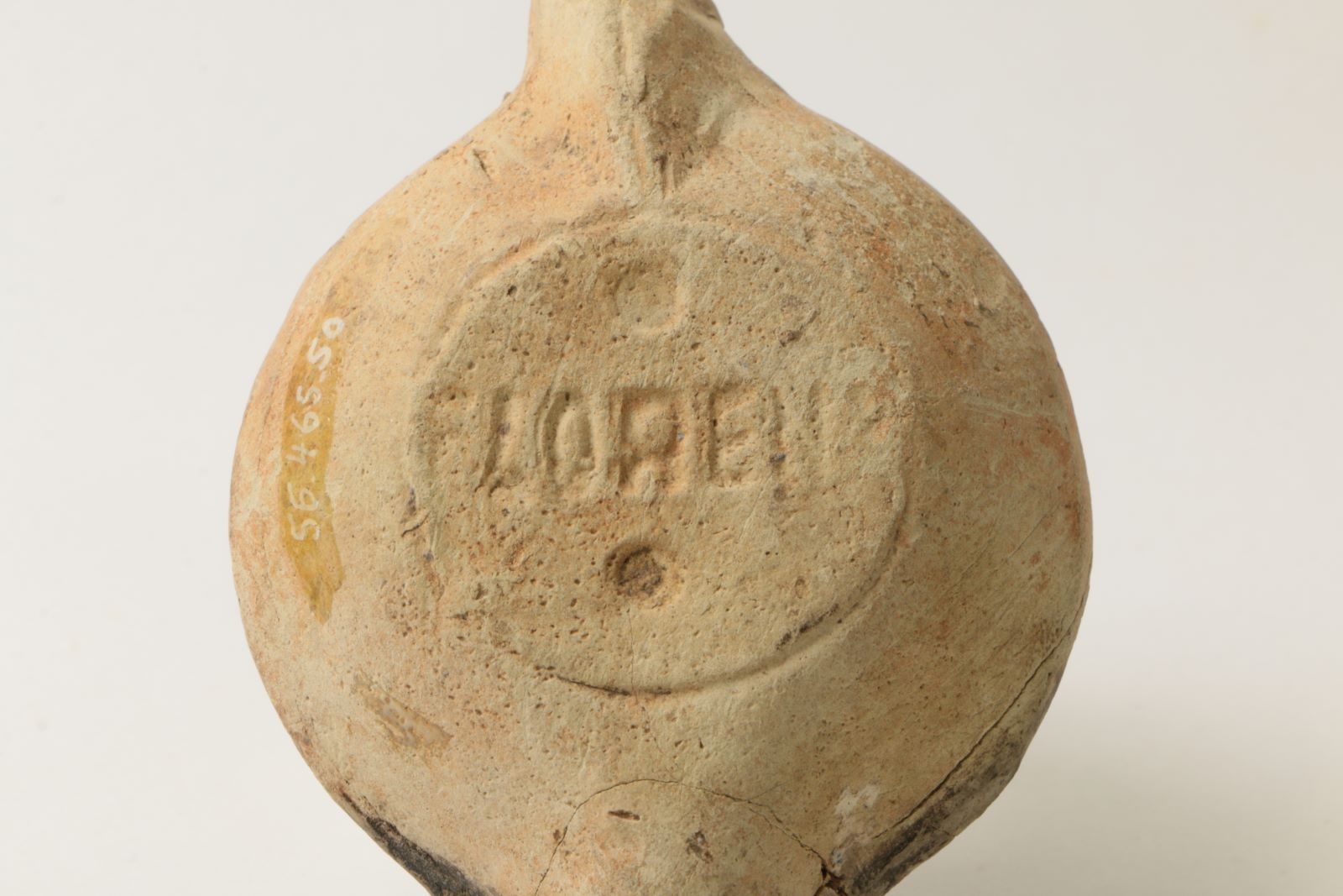 Loeschcke VIII L3 - Bailey P1. Lampe moulée avec une anse. Anse verticale percée se poursuivant jusqu'à la base, avec deux sillons sur la tranche. Réservoir circulaire de profil tronconique. Disque en cuvette limitée par deux sillons. Trou de remplissage à gauche du décor. Bandeau penché vers l'extérieur. Bec limité par un trait ponctué aux extrémités. Base circulaire plate soulignée par un sillon enfermant la marque de potier en creux "FLORENT". Bec restitué. Traces d'utilisation.