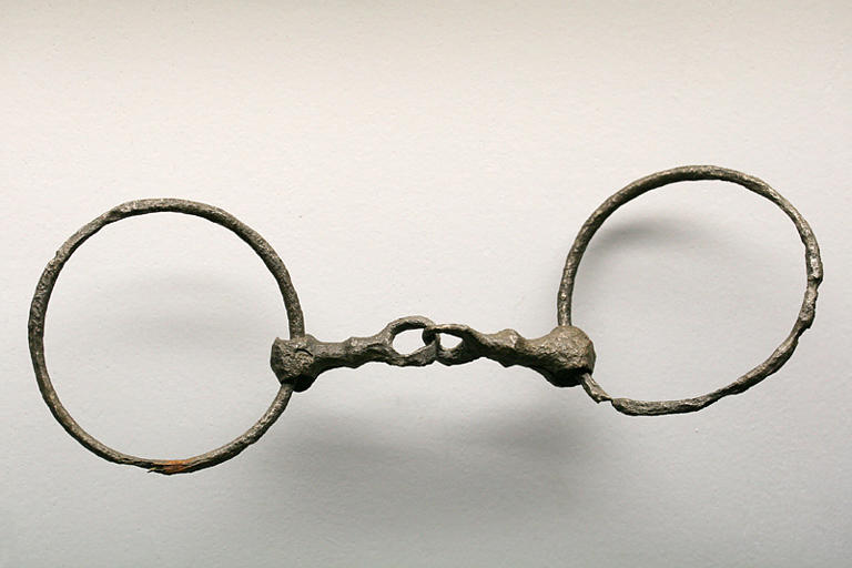 Mors de filet. Objet à embouchure brisée avec articulation centrale et un anneau mobile aux deux extrémités de section circulaire.
