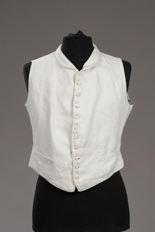 Gilet à petit col rond en épais sergé piqué de coton blanc formant des rayures ton sur ton, fermé par 11 petits boutons recouverts du même tissu, 2 poches gilet, dos et doublure en toile de coton blanc, patte de serrage à boutonnière pour boucle amovible.