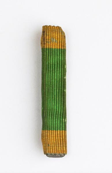 Barrette de décoration militaire, peut être celle de l'engagé volontaire (avant 1914?). De forme rectangulaire, elle est constituée d'un tissu en soie recouvrant une plaque de fer. Verte au centre et jaune sur les deux extrémités.