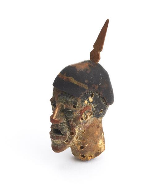 Cette oeuvre est réalisée en bois (peint). Mesures : L. 2.5 cm ; l. 1.5 cm ; H. 5 cm ; L. 4.5 cm ; l. 3 cm (manche). Sujet représenté : Première Guerre mondiale,représentation humaine (homme,soldat ),représentation d'objet (casque). L'oeuvre date de la 1er quart 20e siècle.