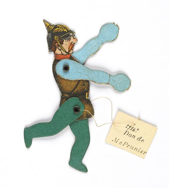 Cette oeuvre est réalisée en carton, bois, fer. Mesures : l. 2.6 cm ; H. 11.2 cm ; E. 0.6 cm (pantin non articulé). L'oeuvre représente : représentation humaine (homme,soldat),représentation d'objet (casque),Première Guerre mondiale. L'oeuvre date de la 1er quart 20e siècle.