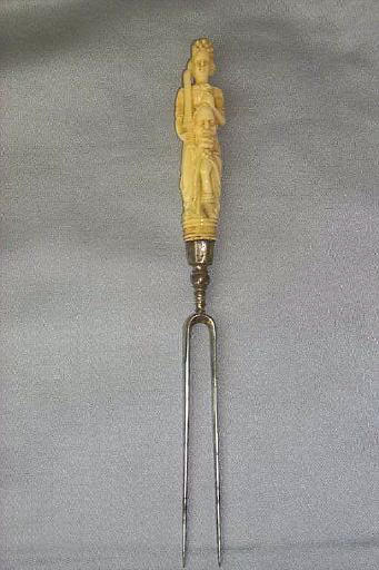 fourchette avec fourchon à deux dents en fer. Manche en ivoire