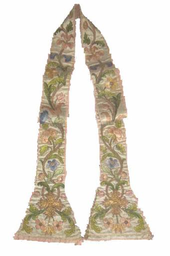 Il s'agit d'une oeuvre en soie, satin (blanc), broderie (point couché), fil d'or, toile. Ses dimensions sont l. 21 ; L. 238. L'oeuvre dépeint : ornementation (fleur orn, feuillage orn, rinceau). Elle est datée de la 18e siècle.