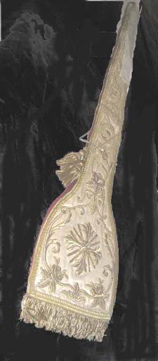Cette oeuvre est réalisée en satin, soie (brodé), or. Le sujet de cette oeuvre : ornementation (rinceau, feuillage orn). L'oeuvre date de la 4e quart 19e siècle.