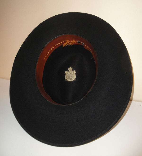 blason doré collé au fond du chapeau et initiales CN cousues à l'intérieur de Carle Naudot